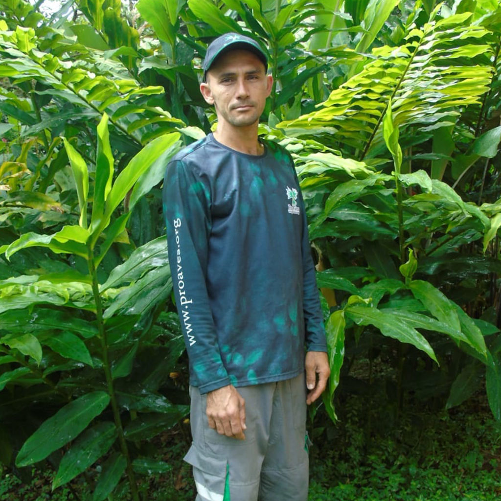 Antes de ser guardabosques, era agricultor en una finca de su departamento. En su ahora, sigue disfrutando de su labor como agricultor, pero con conciencia de la conservación. Sus días no solo se pasan en complacerse del mágico paisaje que la Reserva le brinda, sino, que también, se encarga de la desinfección y mantenimiento de los comederos de las aves, recolección de los cultivos de café y cacao, monitoreo de aves, recorridos de control y vigilancia, cuidado de la casa, la huerta y los viveros.