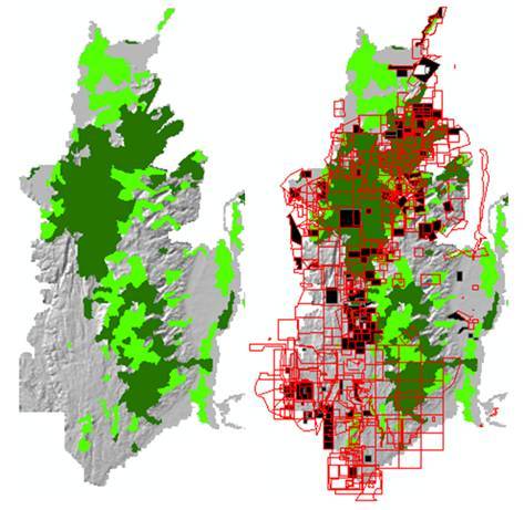 Map of Serranía de San Lucas showing forest cover (left) with surviving forest (dark green), cleared forest (gray) and recent deforestation (light green) and mining concessions (right) with mining rights in red. Source: Ingeominas 2009.