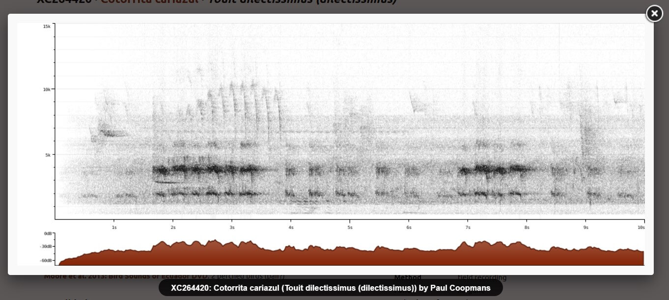 Vocalización de la Cotorrita cariazul (Touit dilectissimus), (Paul Coopmans, xeno-canto)