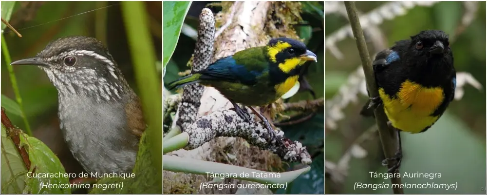 This is one of the richest birdwatching sites in Colombia, with a record of 348 bird species belonging to 45 families. Among them are the Munchique Wood-Wren (Henicorhina negreti), the Gold-ringed Tanager (Bangsia aureocincta), and the Black-and-gold Tanager (Bangsia melanochlamys) — all endemic and categorized as Vulnerable (VU) according to the IUCN Red List of Threatened Species. The reserve also protects a wide variety of orchids and bromeliads, characteristic of the region.