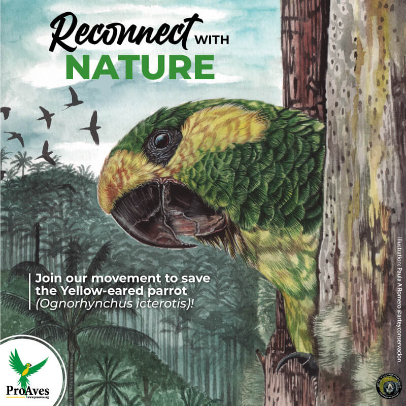 Twenty years ago, ProAves had a dream to save the Yellow-eared Parrot (Ognorhynchus icterotis) from the brink of extinction. For more than twenty years, ProAves has been leading the community-centered campaign Reconcile with Nature in local communities. This campaign aims to raise awareness about the Quindio Wax palm (Ceroxylon quindiuense), which is the habitat and nesting site of the Yellow-eared Parrot. Thanks to ProAves’ conservation efforts, the Yellow-eared Parrot has been saved from near extinction.