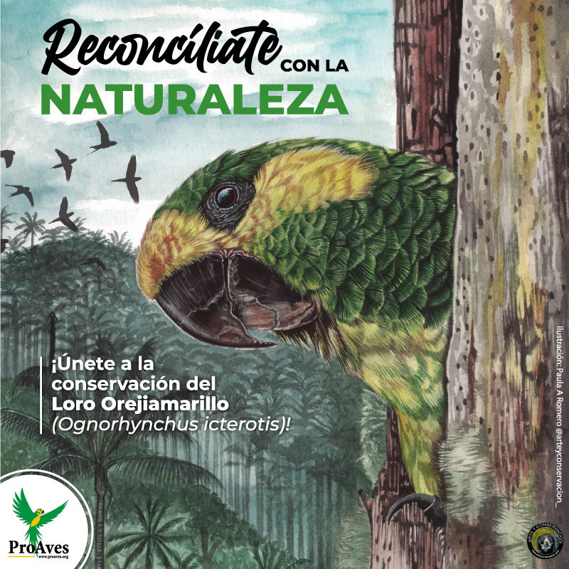 Con el sueño de salvar de la extinción el Loro Orejiamarillo (Ognorhynchus icterotis), ProAves viene desarrollando por más de 20 años la estrategia: Reconcíliate con la Naturaleza, una campaña comunitaria que busca sensibilizar a la población sobre el no uso de Palma de Cera (Ceroxylon quindiuense), sitio de anidación del Loro Orejiamarillo y especie que, gracias a esta y otras estrategias de conservación, se ha salvado de su extinción.