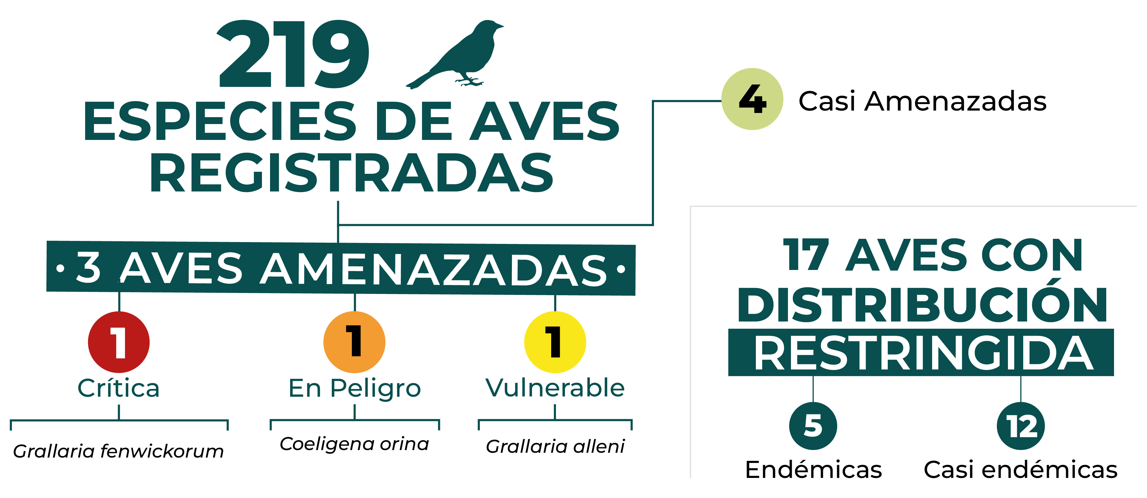 La Reserva Natural es hogar de 371 especies de aves, entre las que se destacan Coeligena orina (EN), Hapalopsittaca amazonina (VU), Diglossa gloriosissima (VU), Grallaria alleni (VU), Grallaria alvarezi (EN) y Grallaria urraoensis (CR).