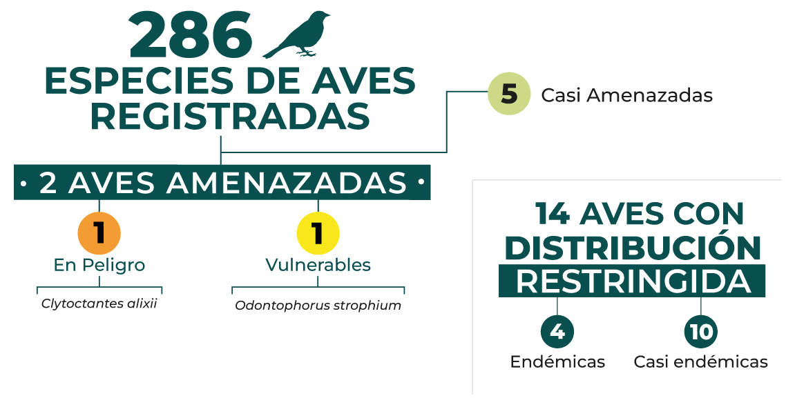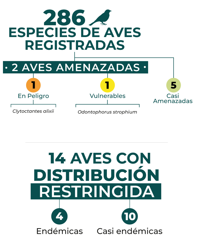 Entre las aves más importantes de la Reserva se encuentran el Hormiguero Pico de Hacha (Clytoctantes alixii), la Perdiz Carinegra (Odontophorus atrifrons), el Arañero Pechigris (Basileuterus cinereicollis), el Gorrión-montés Bigotudo(Atlapetes albofrenatus) y el Frutero Pechidorado (Pipreola aureopectus).