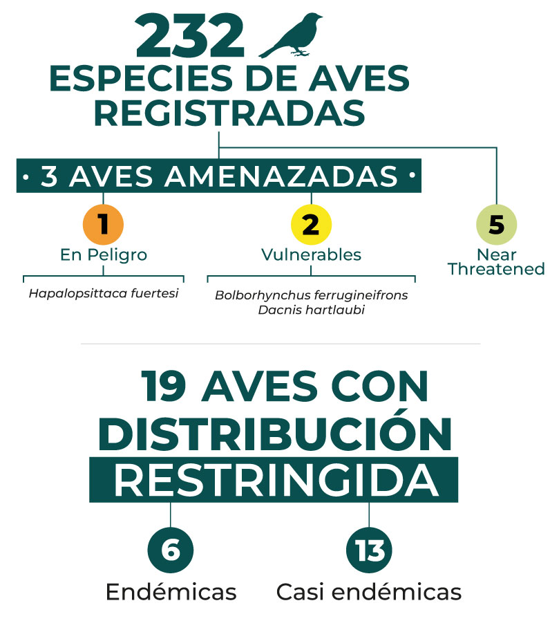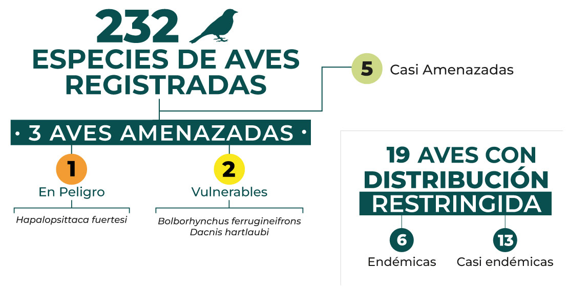 especie endémica y en peligro crítico, el Loro Paramuno (Leptosittaca branickii), especie considerada vulnerable, y el Perico Frentirrufo (Bolborhynchus ferrugineifrons), especie endémica y considerada en peligro.