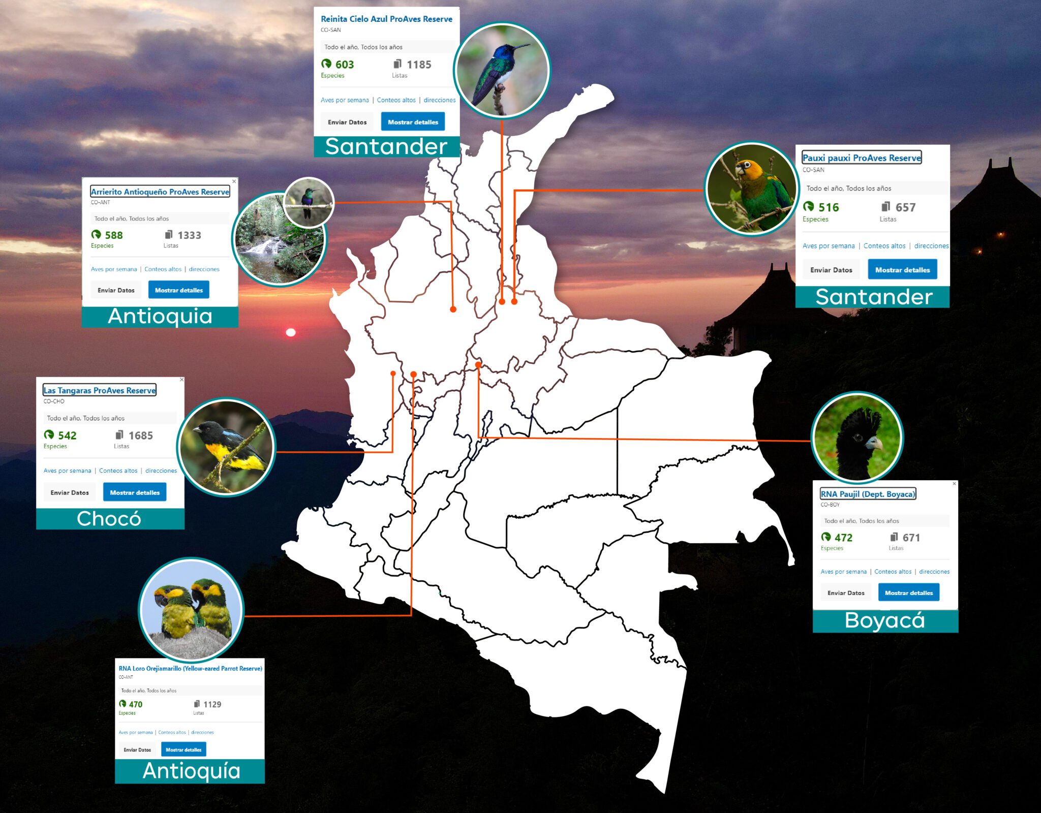 Entre estos sitios, se resalta la aparición de tres de las Reservas de ProAves ubicadas en Colombia: Reservas ProAves Reinita Cielo Azul, Reservas ProAves Arrierito Antioqueño y Reservas ProAves Las Tángaras, las cuales, figuran entre los cinco primeros sitios de interés para el avistamiento de aves en Colombia y que en total seis Reservas figuran entre los primeros 16 sitios, siendo las otras tres: Reserva ProAves Pauxi Pauxi, Reserva ProAves El Paujil y Reserva ProAves Loro Orejiamarillo.