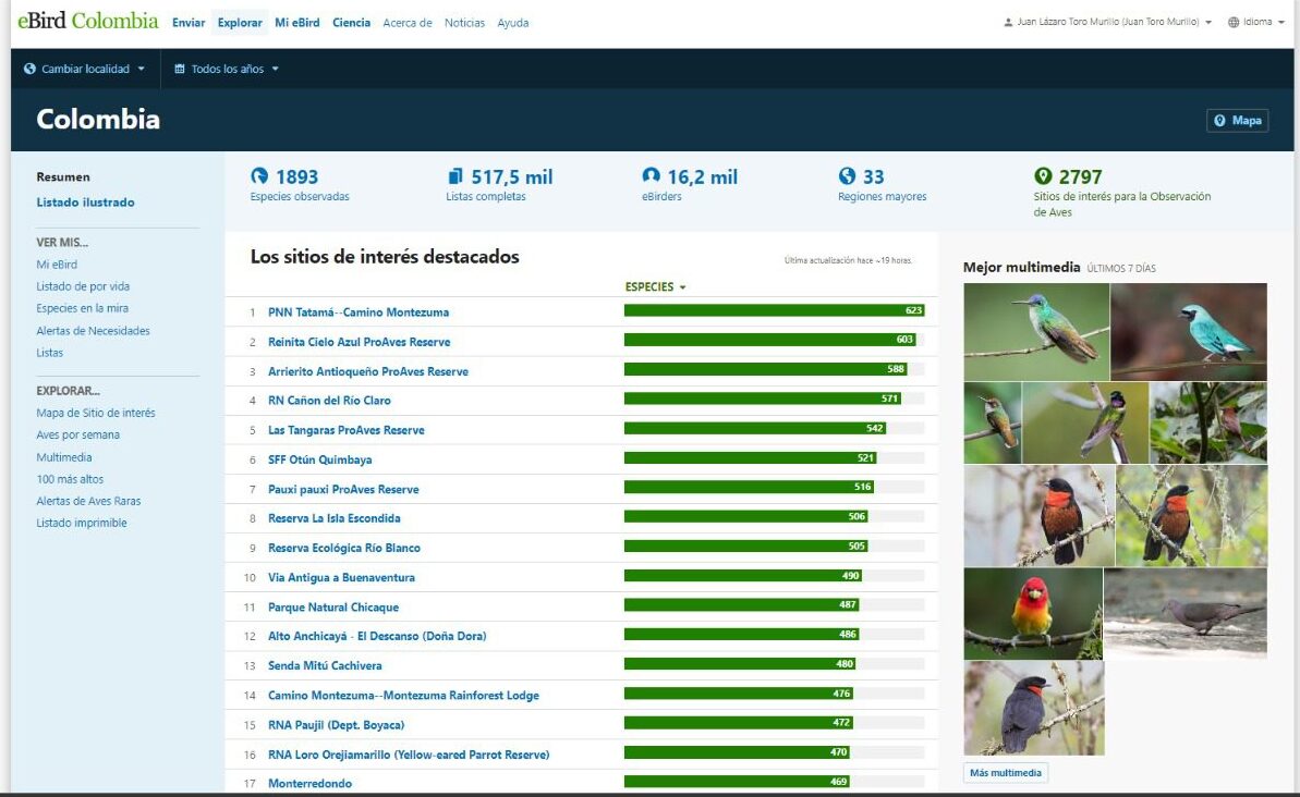 eBird es una herramienta lanzada en el 2012, que permite registrar y contabilizar el número de individuos por especie durante los recorridos de avistamiento, lo cual, se convierte en un ejercicio de ciencia ciudadana porque al realizar este tipo de registro en la plataforma, se aporta información valiosa como registro de presencia, fotos, observaciones y sonidos de las especies de aves avistadas en un recorrido. En Colombia 16.100 ornitólogos o aficionados cargan información a esta plataforma, donde, a 31 de agosto de 2022, se contó con 514.200 listados de 2.796 sitios en el registro.