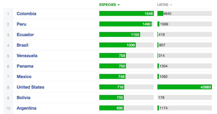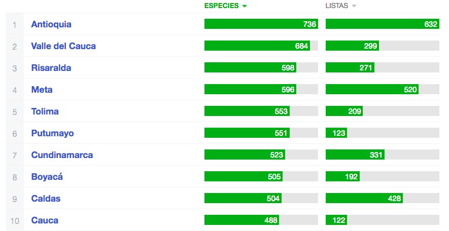 En nuestro país, y desde el punto de vista de las divisiones político-administrativas, el departamento de Antioquia presentó el mayor número de registros (736 especies reportadas en 632 listas), seguido por el Valle del Cauca (684 especies en 299 listas) y por Risaralda (598 especies en 271 listas).