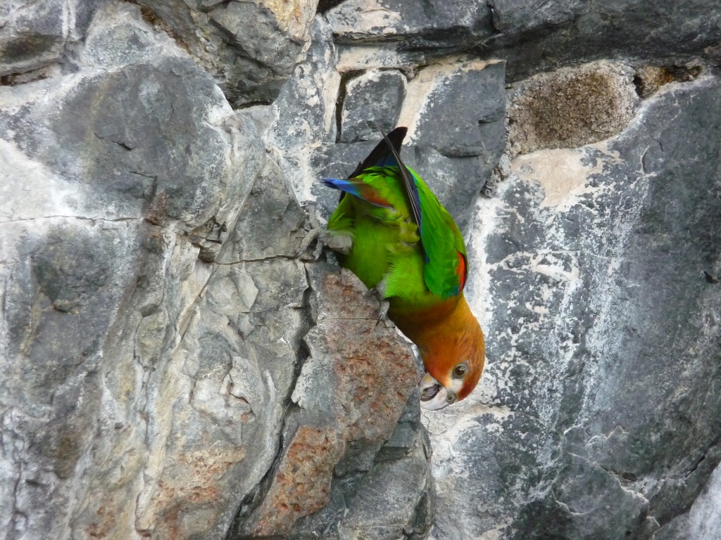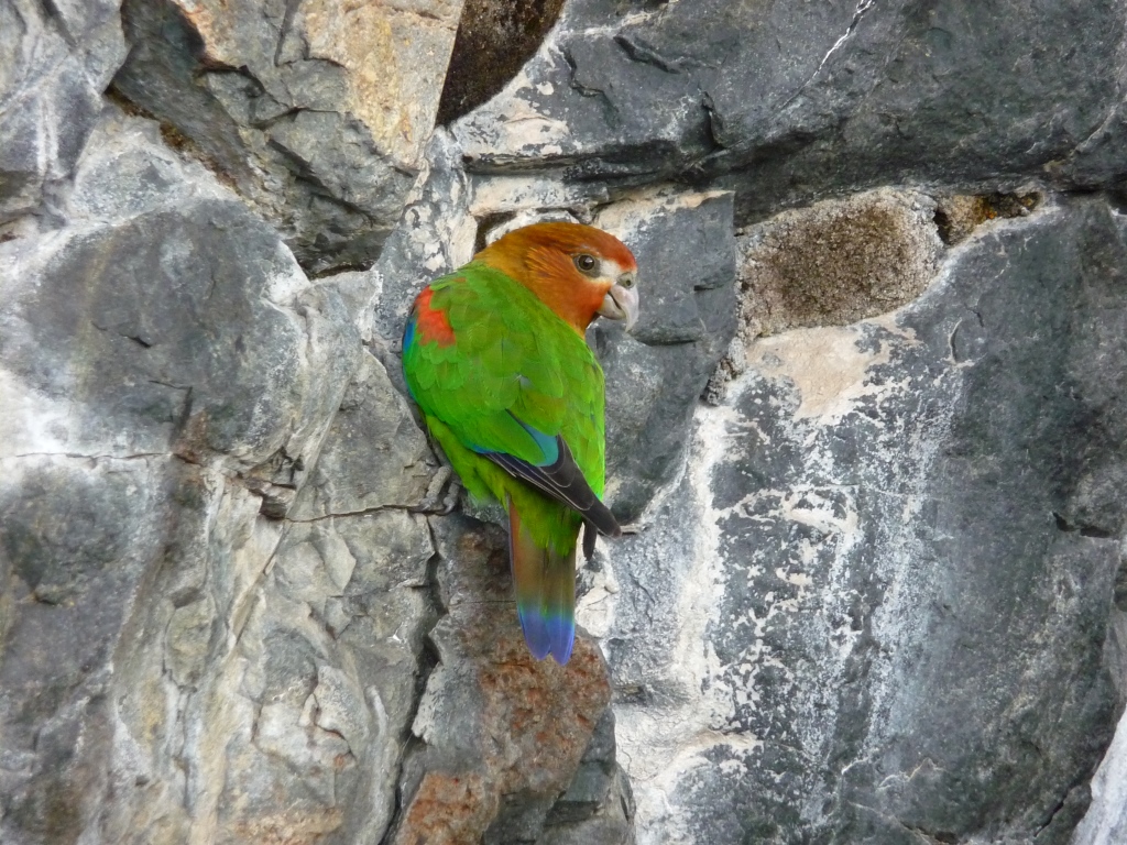Esta pared rocosa en un sitio de interés y oportunidad para observar el comportamiento y conteo de este lorito multicolor.
