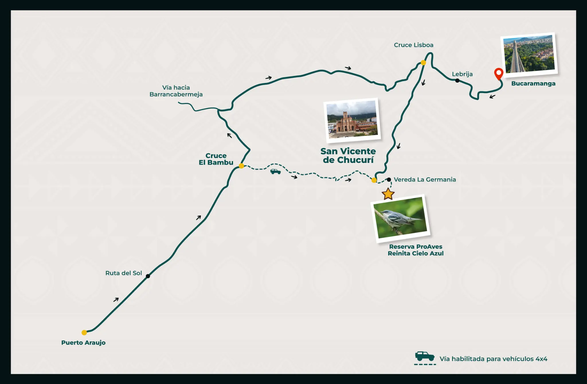 Desde Bucaramanga debe coger la vía Girón-Lebrija hasta el cruce de Lisboa, tiempo aproximado 1 hora. Desde allí se toma la vía a San Vicente de Chucurí bordeando el proyecto hidroSogamoso.
