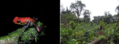 Izquierda Oophaga occultator – Derecha, ambiente deforestado. Alrededor, las occultator cantaban toda la mañana.