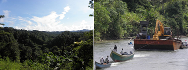 Cultivo de coca (izquierda) en expansión hacia las selvas del río Guanguí – (derecha) Retroexcavadora para minería en el río Saija.