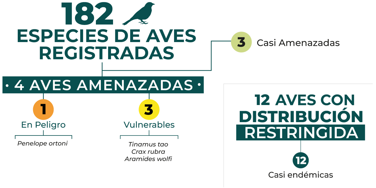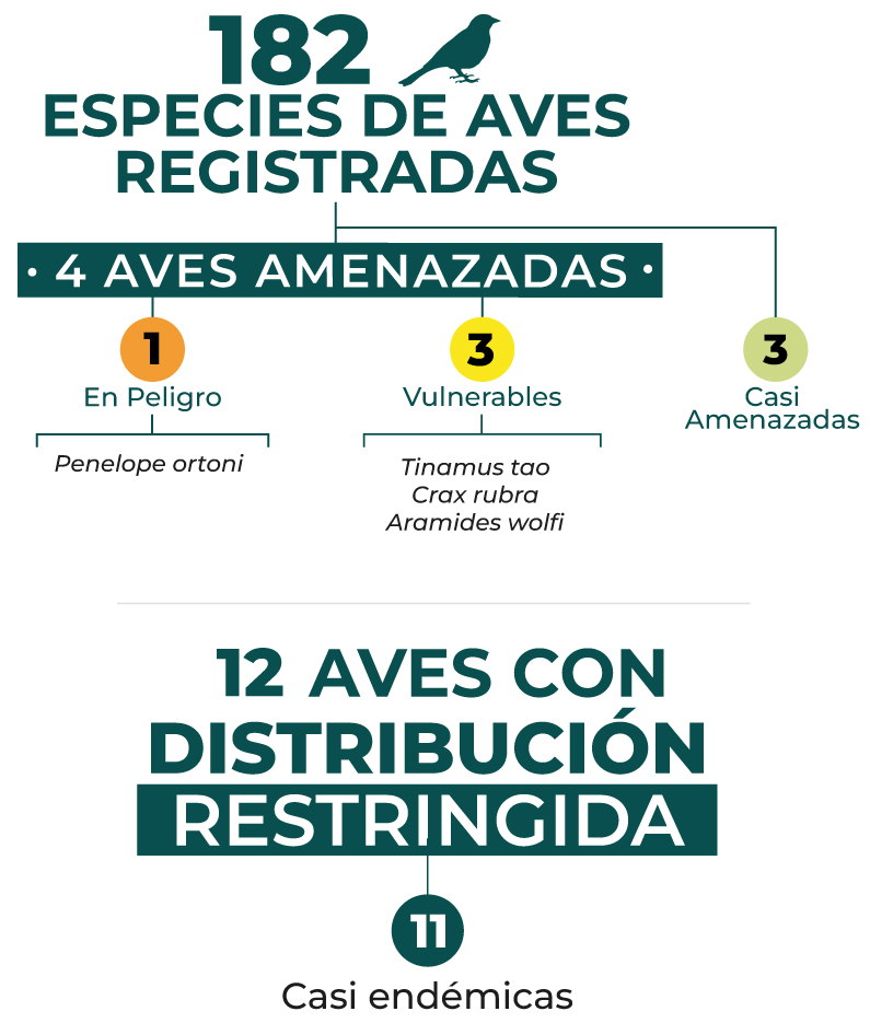Además, en este santuario de conservación se puede divisar el Tinamú Negro (Tinamus osgoodi), el Pico Agudo (Oxyruncus cristatus), el Tapaculo de Stiles (Scytalopus stilesi), el Hormiguero de Parker (Sercomacra parkeri), el Azor Collajero (Accipiter bicolor), el Cacique Candela (Hypopyrrhus pyrohypogaster), la Tangara Multicolor (Chlorochrysa nitidísima), la Bangasia Negro y Oro (Bangsia melanochlamys) y la Reinita Cerúlea (Dendroica cerulea), especie migratoria que visita la reserva en su época no reproductiva.
